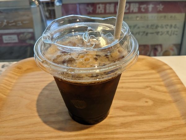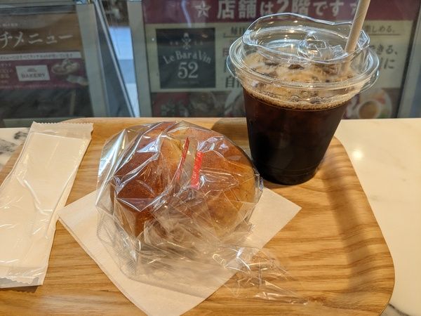 今回のイートインでは、アイスコーヒーと「全粒粉入りもっちり湯種ベーグル」を選択。期間限定のコーヒーSサイズ無料サービスが実施中だったため、全粒粉入りもっちり湯種ベーグルのみの料金となりました。