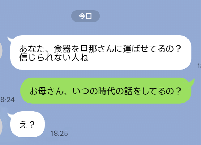 そんなことは妻がやるべきで夫がやることではないという母の思想を伝える言葉でした。何度言っても腰が重い夫が、やっと自分の食器は自分で片付けてくれるようになってきた矢先だというのに、私の努力ややり方を覆されたように感じました。