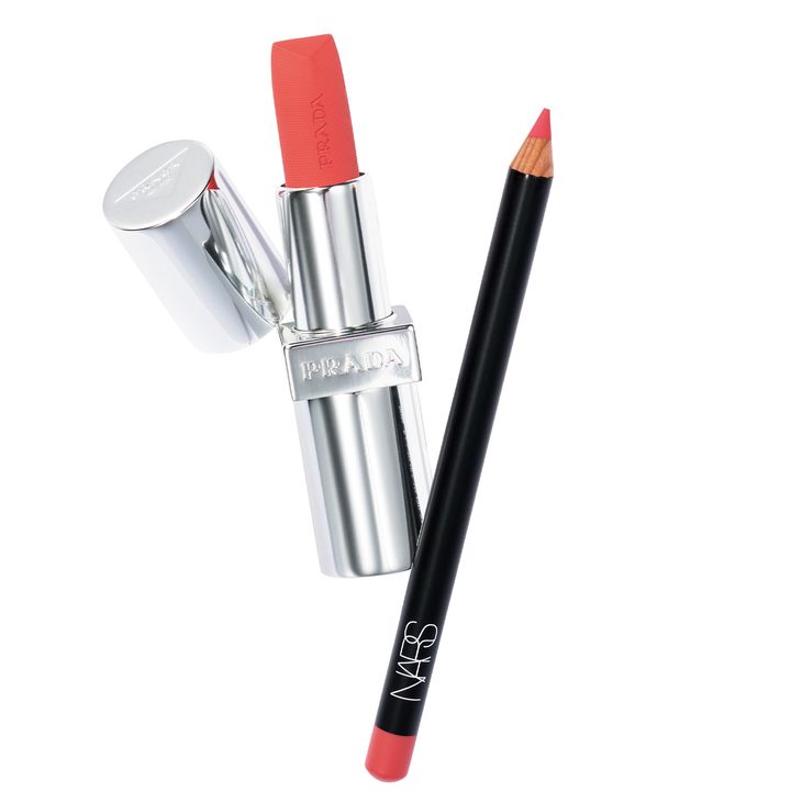 左/話題のプラダ ビューティのリップは上品な輝きとおしゃれな色出しが魅力。いち早く試してみたい。モノクローム ウェイトレス リップカラー(スムース ナイロン)O 176¥6,930(プラダ ビューティ)