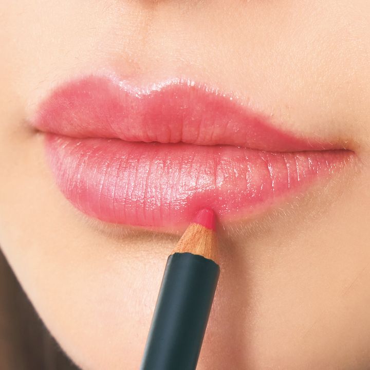 色持ちがよく、輪郭がしっかりとれるリップペンシルで全体をオーバーめに縁取ります。シアーマットな口紅を直塗りすれば完成。