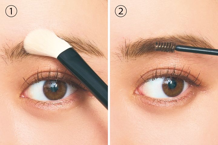 眉を描く前に毛足の長いブラシにフェイスパウダーを含ませ、眉全体にのせて。余分な皮脂を抑えることでアイブロウがキレイにのります。