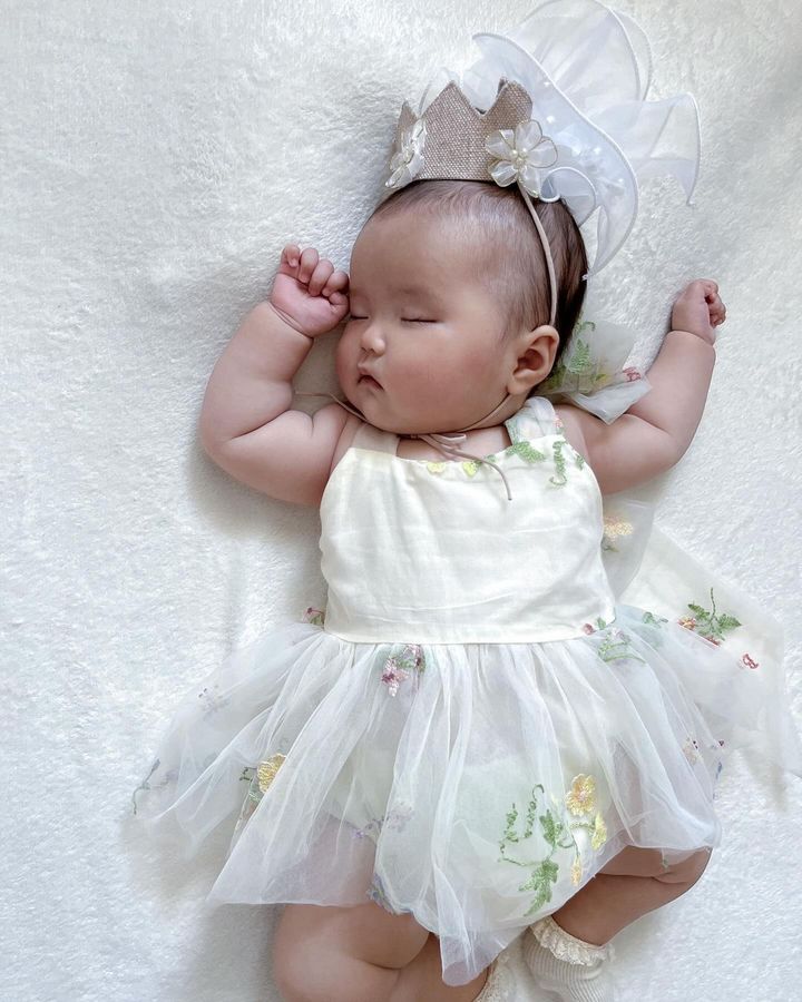 素敵なドレスを着た小さなプリンセス。バンザイ寝がかわいいですよね。