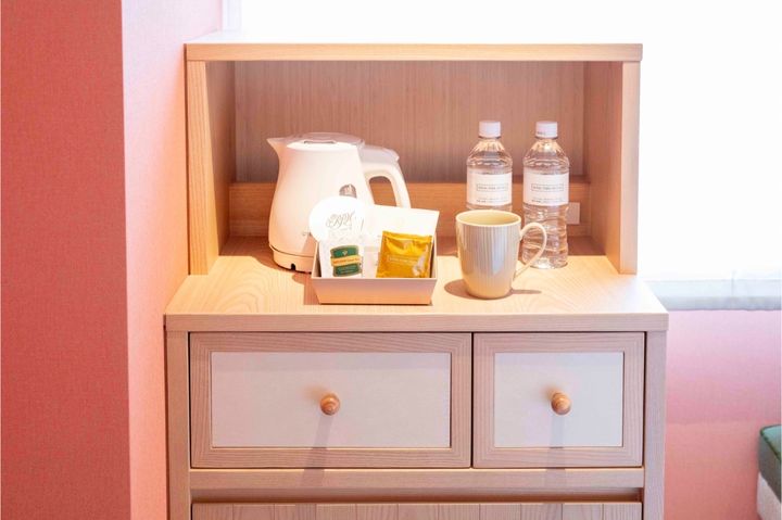 ミニバーには「MITSUMOTO COFFEE」のオーガニックのドリップコーヒーと、キーコーヒーの緑茶、ロイヤルパークホテルオリジナルのダージリンティが用意されています。ベージュのマグカップもお部屋の雰囲気にぴったり。