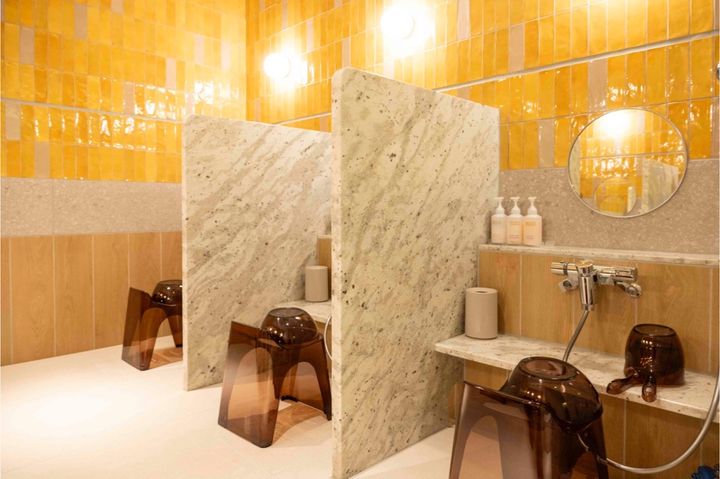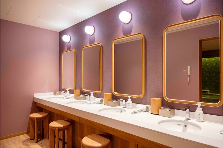 洗い場は6つあり、隣の席とのパーテーションも深めで使いやすい造りに。アメニティは真珠で有名なMIKIMOTOのアメニティブランド「MIKIMOTO COSMETICS」、シャワーにはRefaのシャワーヘッドと、こだわりのアイテムが設置されています。