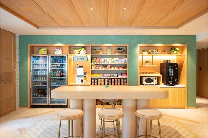 ロビーの一角にはお菓子やインスタント食品、ドリンクなどが購入できる「SNACK & DRINK STATION」があります。セルフレジなので24時間購入可能です。