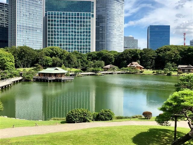 夏の緑豊かな潮入の池周辺(お伝い橋・4つの御茶屋)と背景の汐留ビル群/公益財団法人 東京都公園協会