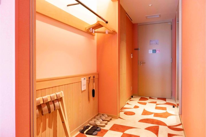 客室のコンセプトカラーは、歌舞伎の定式幕にある柿色と萌葱色になっていて、ツインルームには柿色をイメージした赤系の色調、ダブルルームには萌黄色をイメージした緑系の色調が使われているんです。