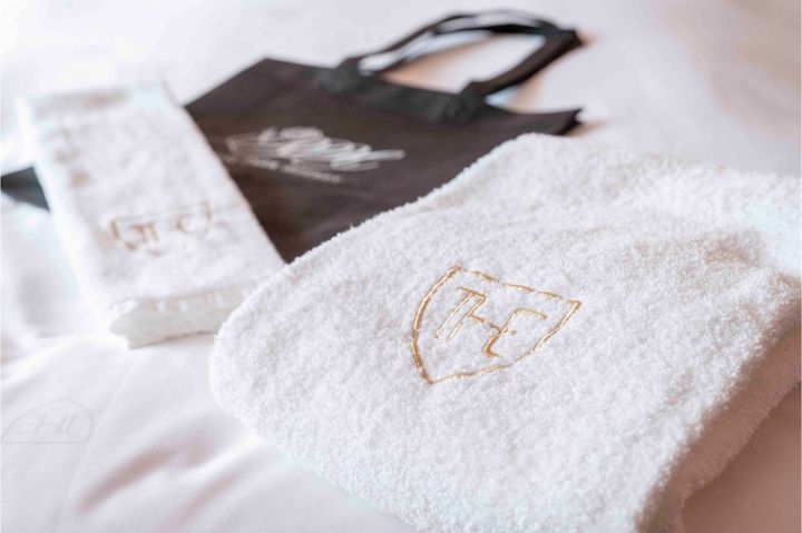 タオルはバスタオルとフェイスタオルの2種類。「THE」という文字をデザインした「ザ ロイヤルパーク ホテル」のロゴが金色の糸で刺繍されていて高級感があります。