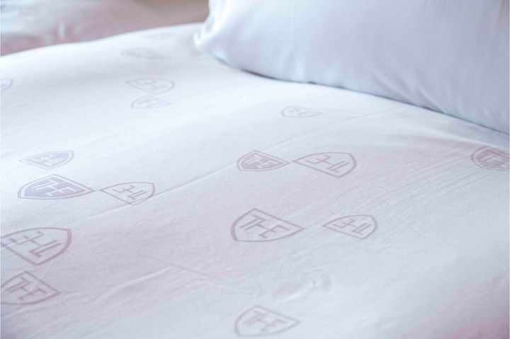 ベッドをよく見ると、光の反射具合でホテルのロゴが浮かび上がる高級感のあるシーツが使われています。こういう控えめなおしゃれっていいですよね。