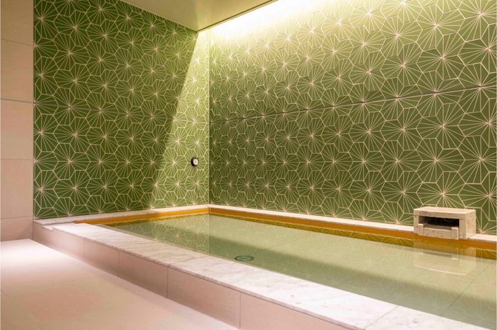 幅の広い浴槽にたっぷりの湯が満たされていて、足を伸ばしてゆったりお風呂に浸かれます。植物をモチーフにしたようなおしゃれなパターンの壁の色と少し明るめの照明が、地下だということを感じさせません。