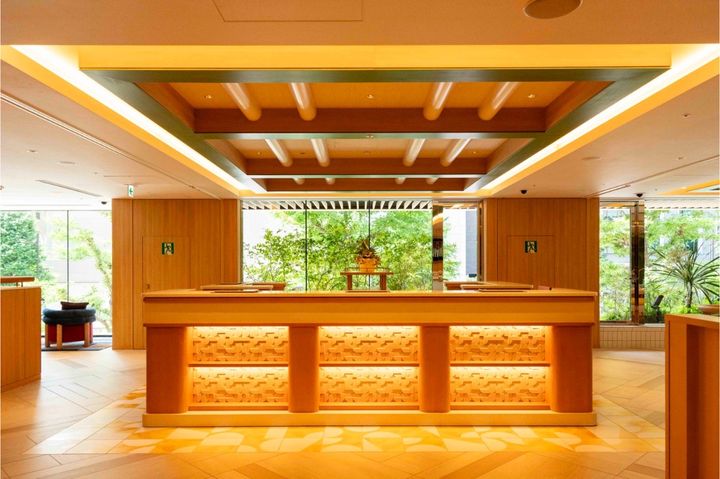 イチョウの葉が舞い散る様子をイメージしたデザインパターンがおしゃれな1階のエントランスを入ると、ふわっとホワイトティーの香りがします。「ザ ロイヤルパークホテル」では、ホテルブランドごとに異なる香りでお出迎えをしてくれるそうです。