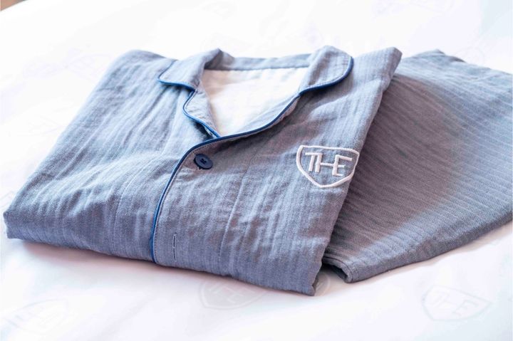 部屋着は柔らかいコットン素材のパジャマ。肌触りのよさと着心地にこだわったセレクトがうれしいですね。