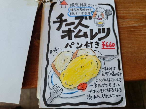 お昼時なので、迷いに迷った末、私はチーズオムレツのパンつきを頼みました。
