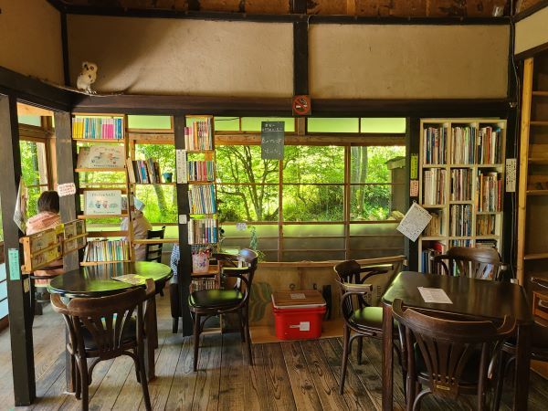 木のドアを開けると、店内はあたたかみのある優しい雰囲気。外の緑が美しい! こんなに緑に囲まれた非日常の素敵な空間があるとは!