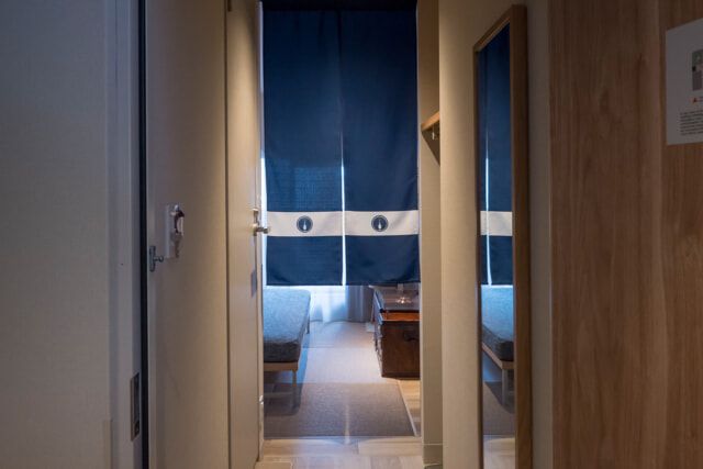 ASAKUSA ROOMは、部屋の入口で靴を脱ぐシューズオフスタイル。短い廊下にはオープンクローゼットや姿見、トイレなどが設けられ、正面の縦長の暖簾もスタイリッシュ。家紋の抱き茗荷が染められています。