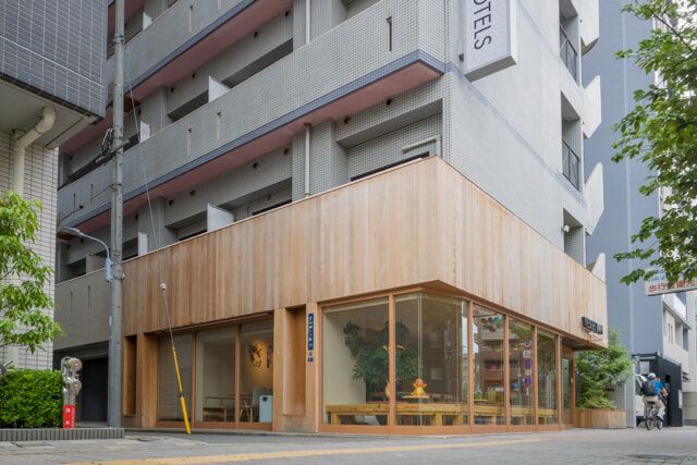 ホテルはウッド調の1階外観と開放感たっぷりの広い窓が目印です。