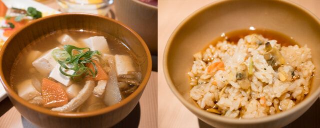 お味噌汁は、浅草汁と浅草粕汁の日替わりです。どちらも東京中野にある「あぶまた味噌」の江戸甘味噌を使ったお味噌汁と粕汁で、この日は浅草汁をいただきました。野菜や豆腐、油揚げなどが入った具沢山で、お味噌の旨味を感じる優しい味わいです。さらに東京の定番「深川めし」は、ポットに入った出汁をかけ、出汁茶漬けとしても食べられます。
