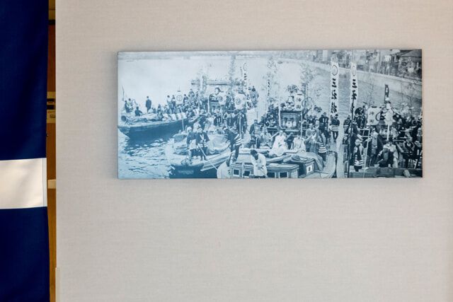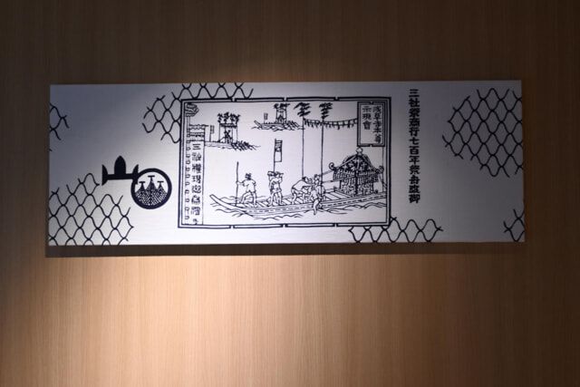 浅草寺の起源は、飛鳥時代の628年に漁師の兄弟が隅田川から引き上げた観音像で、船に神輿を乗せる「船渡御(ふなとぎょ)」の祭事が江戸時代末期まで行われていました。部屋には1958年に一度復活した船渡御の写真が飾られていました。