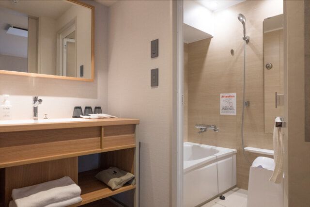 ASAKUSA ROOMとスーペリアルーム、デラックスルームは水回りが独立したタイプ。その他の客室はユニットバスになっています。客室には歯ブラシなどのアメニティは用意されていないので、1階のアメニティバーから必要なものをピックアップします。