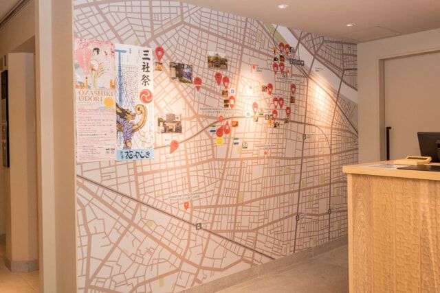 ▲フロント横の壁には周辺マップがあって、お店の情報などが記されます