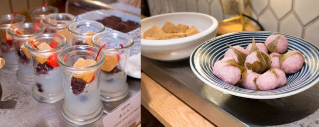 下町のお菓子をそろえた “浅草スイーツ” もここならでは。メニューは日替わりで、この日はあんみつやマンゴープリン、わらび餅のほか、季節に合わせて桜もちもありました。