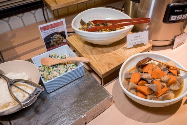 唐揚げやラタトゥイユなどの温かいメニューが並びます。とりわけ注目は、浅草のお祭りをイメージした華やかなオリジナルちらし寿司。彩り豊かで酢飯の優しい味わいは、朝にうれしい一品です。