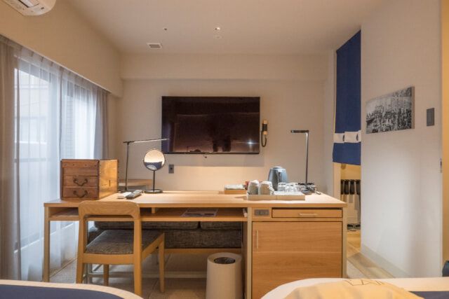 冷蔵庫やポット、カップ類などは客室中央のデスクに用意。細身のデスクライトもお洒落で、しっかりと作られた机は存在感があって部屋の装飾としての役割も果たします。