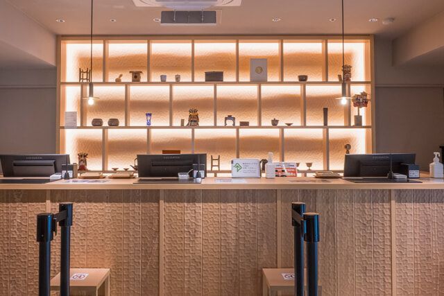 フロントデスクには削り跡を残した “なぐり加工” が施され、木材の質感を際立たせます。背後の棚は間接照明で照らされて、漆塗りの酒器や江戸切子などの工芸品を飾り、訪れたゲストに江戸/東京の伝統を伝えます。