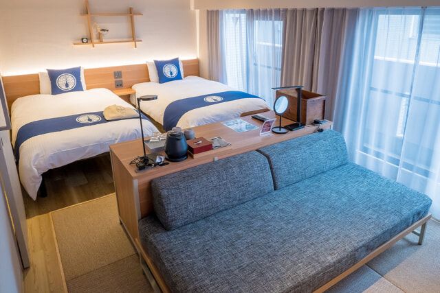 ASAKUSA ROOMはスーペリアルームと同じ間取りで、部屋の中央にあるデスクを境に、リビングエリアとベッドエリアから成っています。ソファーベッドを使うことで、大人は最大3名まで宿泊可能。クッションやベットスローなどにも抱き茗荷が記され、浅草らしい伝統を感じる客室です。