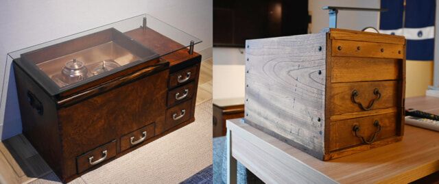 江戸時代から庶民の暖房器具や湯沸かしとして使われた長火鉢が床に置かれ、後から板ガラスを張って、中には茶釜を納めています。デスクの上にも江戸時代に商家で小銭入れとして使われた銭箱が飾られ、商人の町浅草に触れられます。