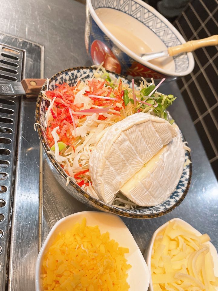日替わりもんじゃ『3種の贅沢チーズもんじゃ』(茶碗)を頼んでみました。想像以上にチーズがたっぷり入っていてテンション上がりました🎶