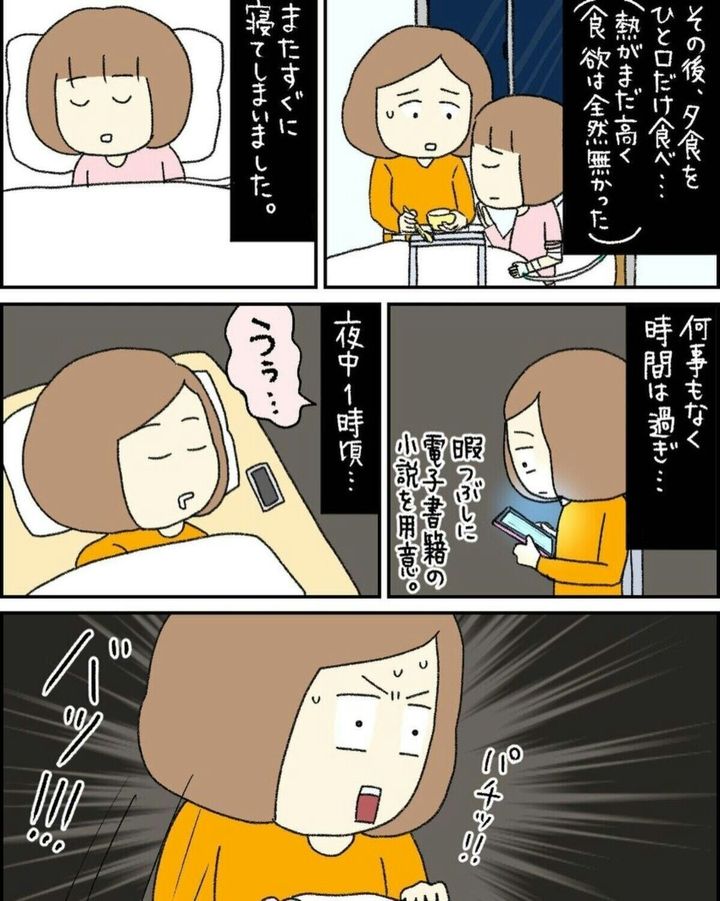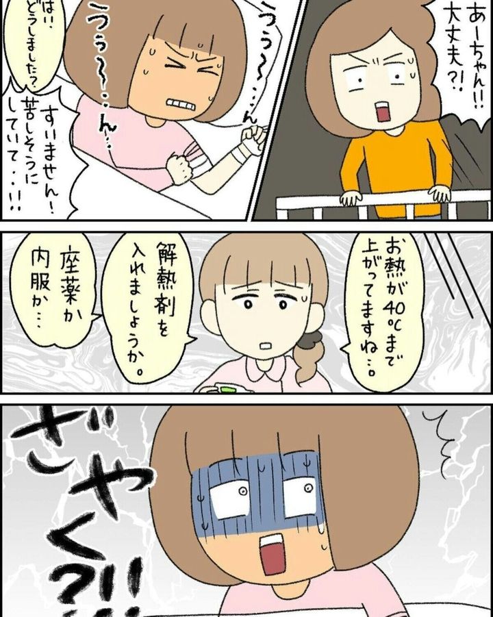 熱性けいれんを引き起こし、グッタリとした状態が続いていたあーちゃん。やっと意識が戻り、一安心。ですが、まだ熱が高い状態が続いていたため、そのまま入院することに決めます。