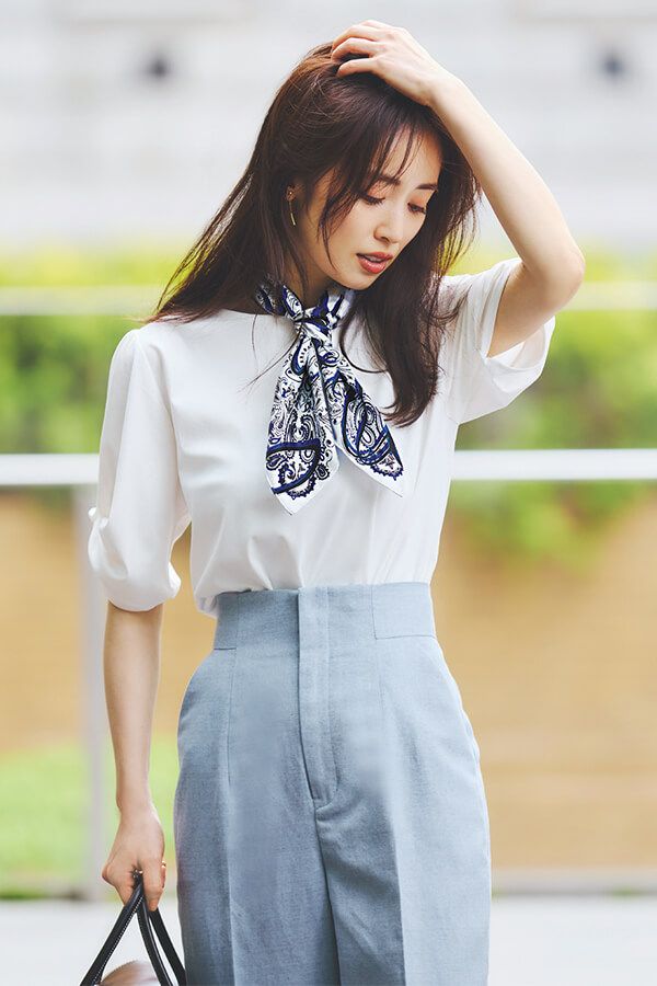 マンネリしがちな夏の通勤ワンツーコーデを更新!【スカーフ】を一点投入で気品のある着こなしに♡