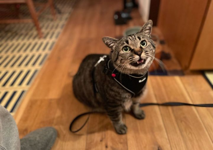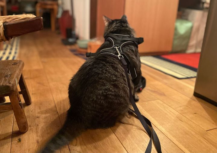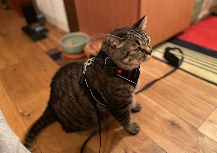 新しいハーネス買うてもらったで! 昔育ててくれたおばあちゃんは、鈴付きの赤い首輪をつけてくれててん。それは今でも宝物で、お母(かあ)は大切にしてくれてる。でも体が大きくなって苦しそうやからって強そうなヤツ買ってくれたわ。これでお散歩したいな〜。