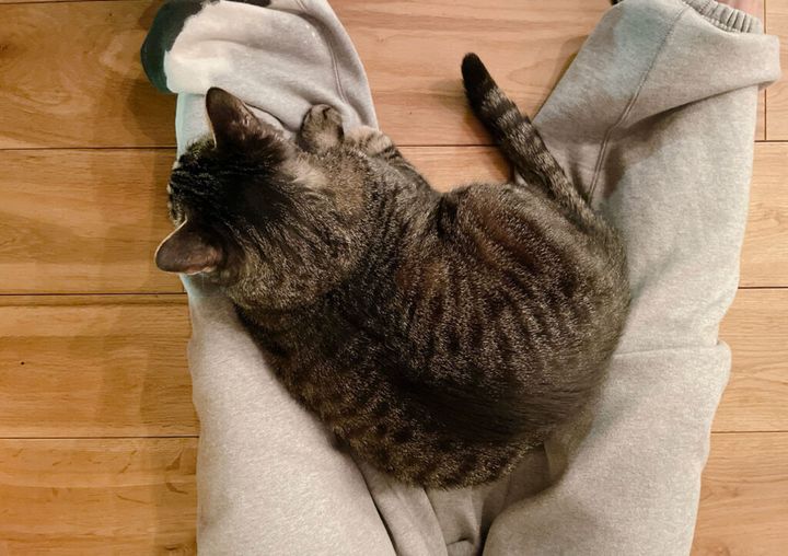 とかなんとか言って、やっぱり首輪はない方が楽やね。ちょっと緊張するしな、お母も、ねこちゃんは自由が一番、何も着ない、つけない姿が一番可愛い!って言うてる(笑)。は〜、お母の足で昼寝するわ〜。おやすみ〜。