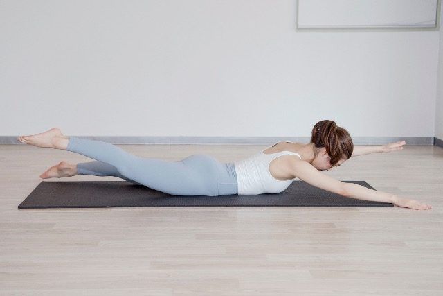 なお、肩や首に余計な負荷をかけないためにも肩と首は自然の位置をキープしておきましょう。また、脚と腕を上げる際は、腕と脚を対角線上に引っ張るようなイメージで。さらに期待する効果をきちんと得るためにも、「恥骨でマットを押さえるイメージで、骨盤底筋(恥骨あたりに位置する筋肉)をしっかり床につけておくこと」を意識してくださいね。<ピラティス監修:KEI(インストラクター歴3年)>