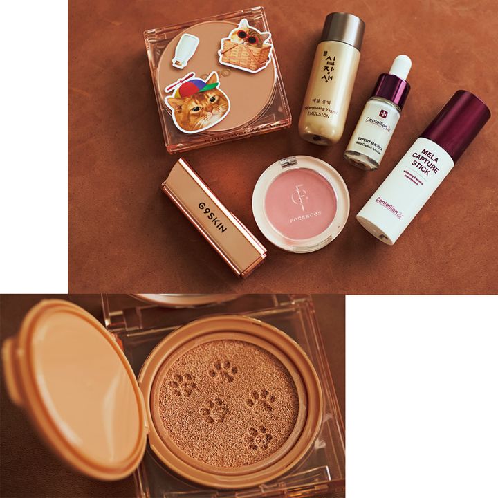 美容液はMELA CAPTURE、センテリアン24。イェギョル乳液も保湿効果が抜群。猫ステッカーを好きな場所に貼れるCLIOのクッションファンデは特にお気に入り。