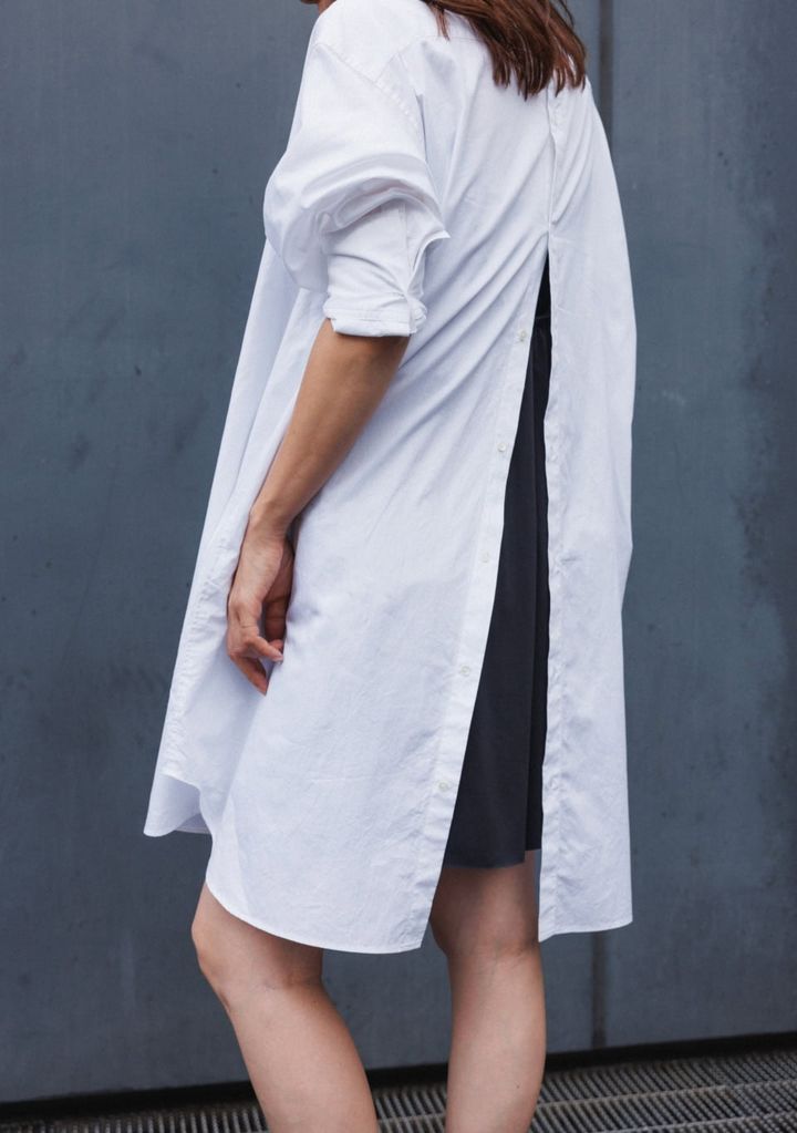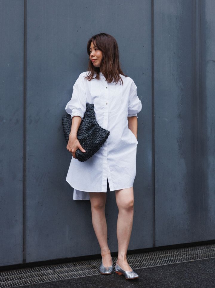 「オーバーサイズシャツをワンピース風に着用しました。ヒールだとコンサバになってしまうので、バレエシューズでハズしてコーディネートを組んでみました。いたってシンプルですが、大きめバッグをクラッチとして持ったり、後ろボタンを外してヌケ感を出したり、細かく計算したスタイリングもポイントです」
