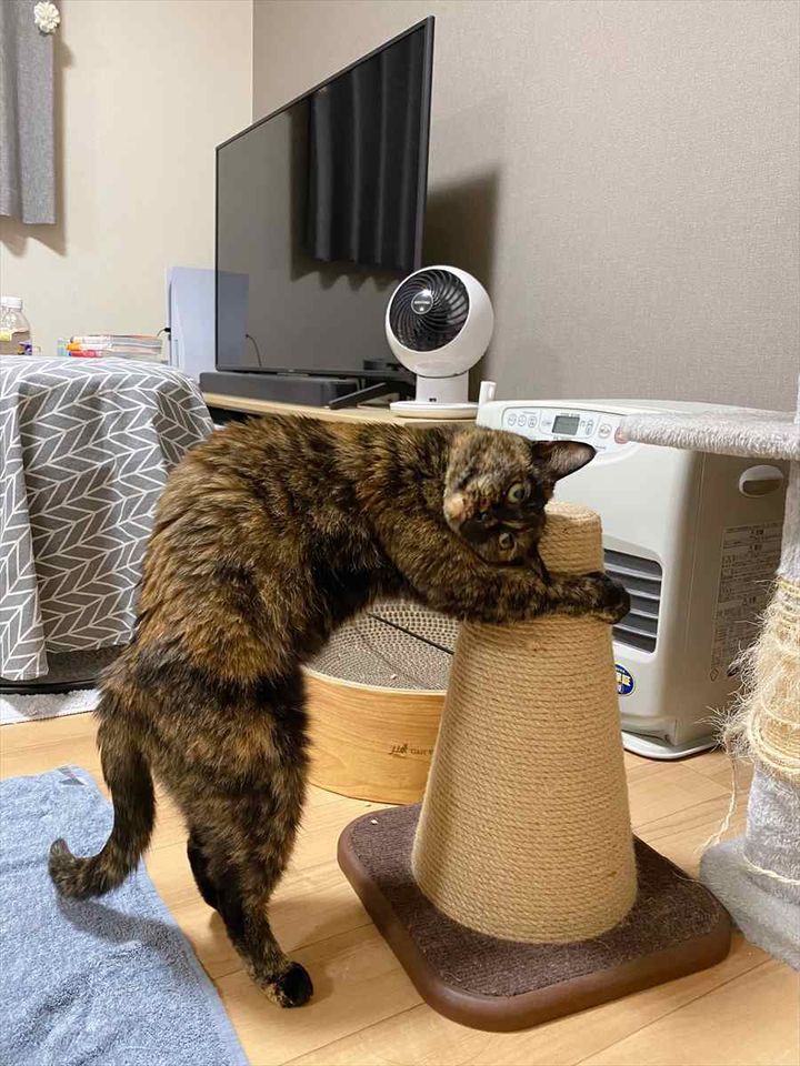 とぽさんによると、爪とぎの上部にお気に入りのポイントがあるようで、「顔をすりつける時は大体このようなポーズをとっています」とのことでした。 爪をといでいるわけではありませんが、さびちゃんが気に入っているのであればいいですね!