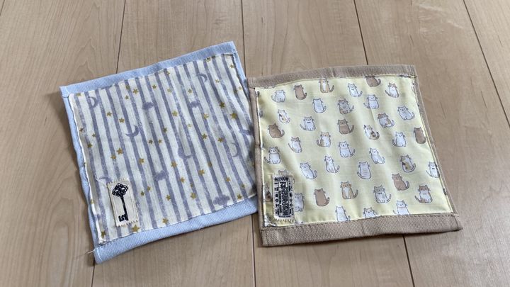 そこで、100均の小さなタオルハンカチをプチリメイクして小型ハンカチを作り、お気に入りハンカチとして使ってもらっています。ハンカチを持つのを忘れてしまいがちな子でも、お気に入りのキャラクター柄などで作れば、きちんと持ち歩いてくれる1枚になるかもしれませんね。