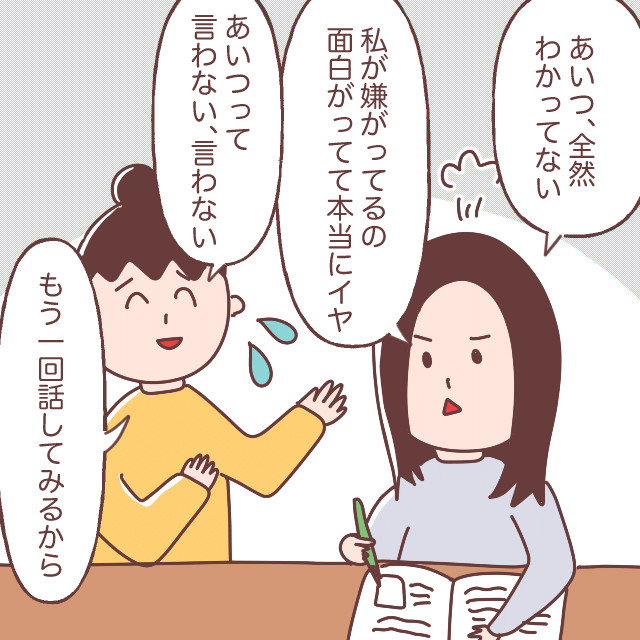 「あいつ、全然わかってない!私が嫌がってるの、面白がってて本当にイヤ!」