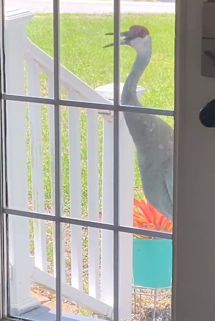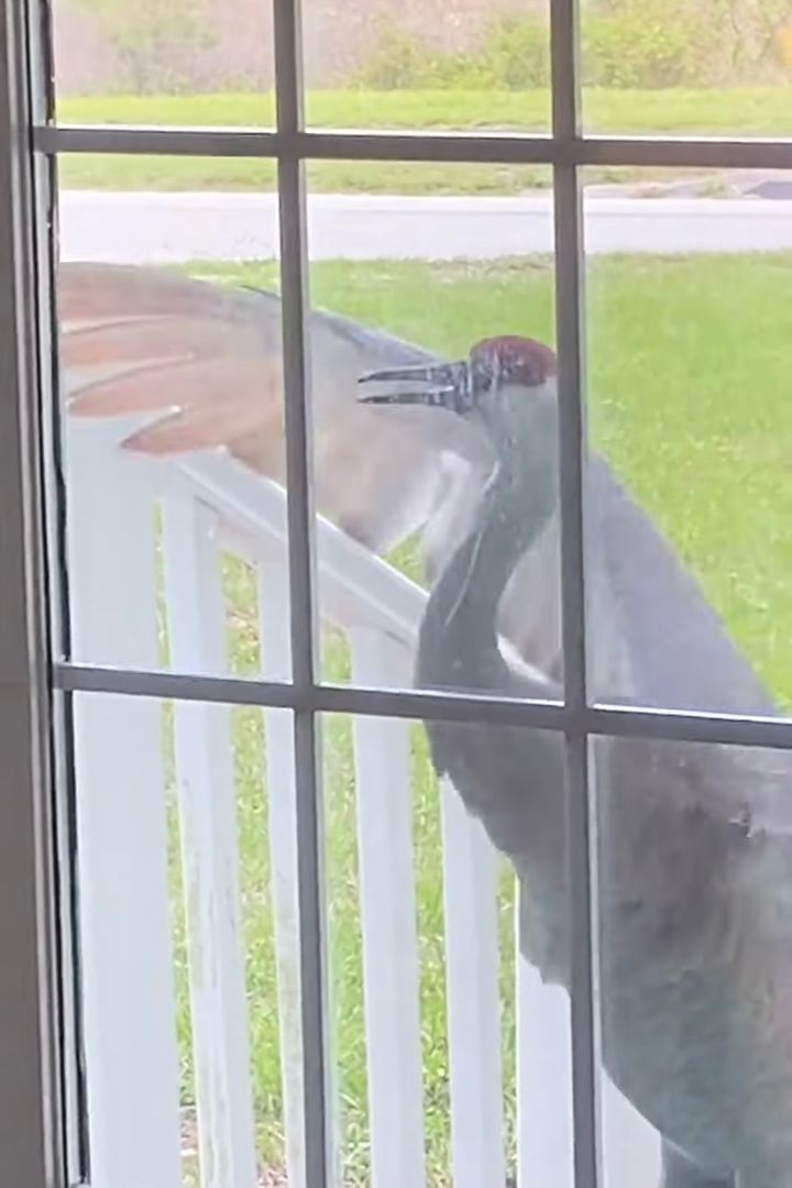 なんでもこのカナダヅル、3年ほど前から遊びにやって来るようになった常連のお客さんなのだとか。 家族にすっかり懐いているのでしょう、こうして気を引こうといつもドアを叩いてアピールするそうですよ。