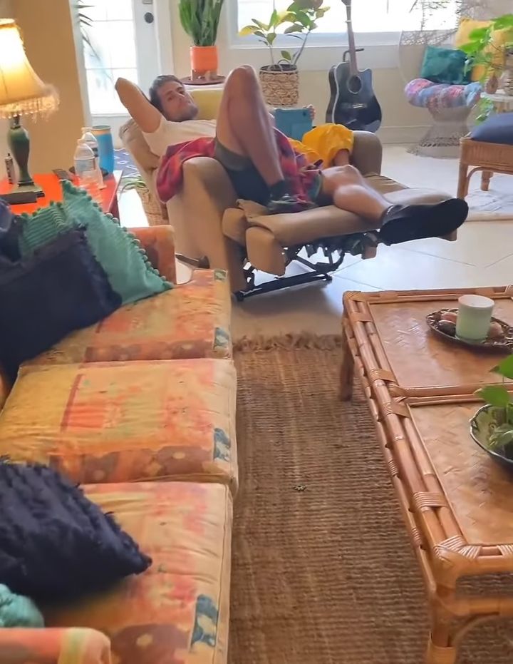 リクライニングソファに腰掛けるこちらの男性は、お昼寝からお目覚めの様子です。 撮影者の女性は「誰が私の夫を起こしたのかしら・・・」とわざとらしく話しながら、玄関のドアにカメラを向けます。