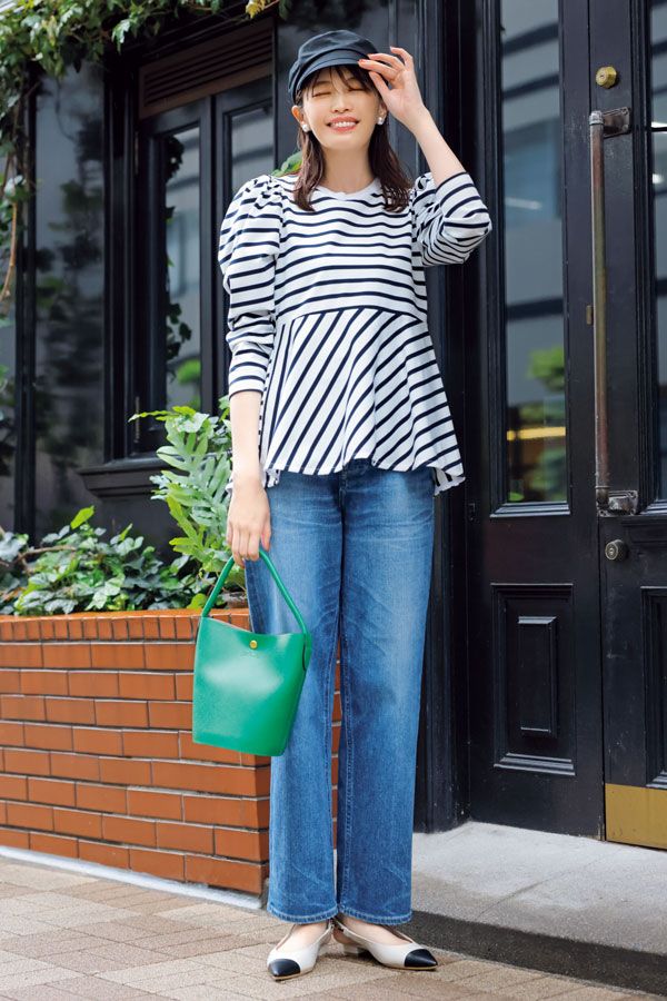ボーダー×デニムのラフカジュアルにパフ袖&フレアヘムで女らしさを。