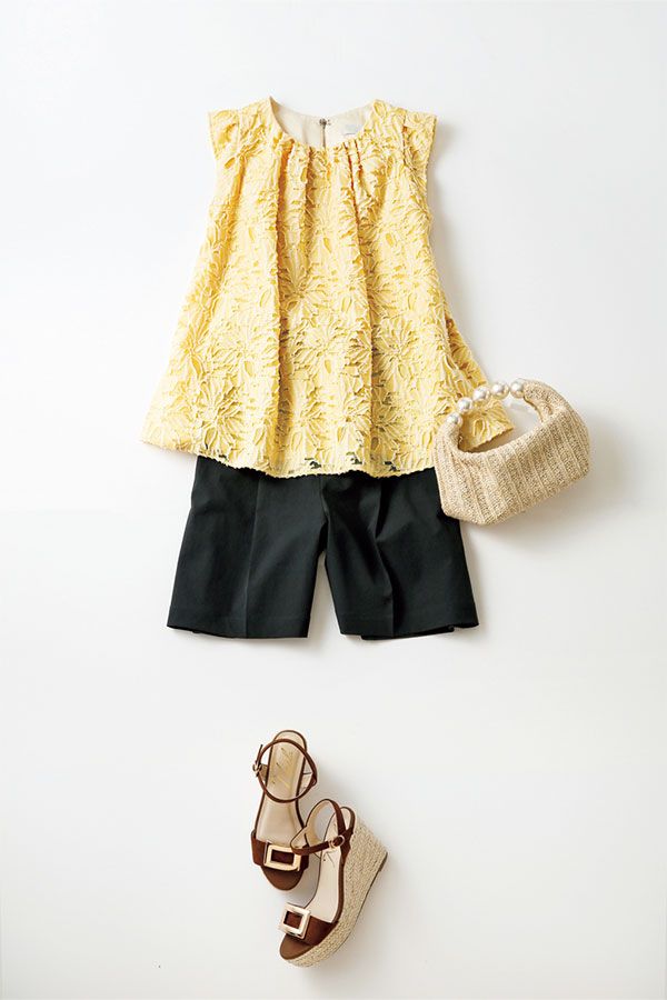 フレッシュなイエローのジャカードレースで今年らしい着映え感をget。軽やかなラフィア小物でリゾート気分をさらに高めて。