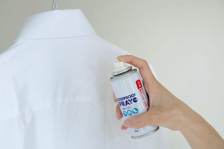 防水スプレーの中でもフッ素加工スプレーは、通気性を確保しながら、水滴だけでなく汚れをはじいてくれるので、衣類にも使えます。