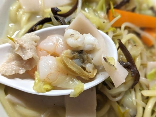 モチモチのちゃんぽん麺もたまりません。鍋炊きしても負けない硬さに製麺された「福岡市川部食品謹製」の麺は、汁気で伸びてしまうこともなく、ゆっくり食べてもモチモチ感が持続します。