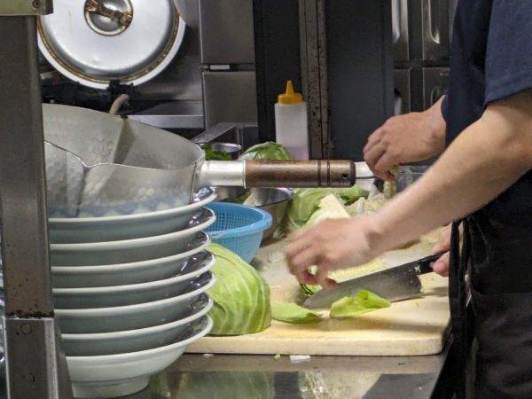 厨房を拝見させていただきました。丸ごとのキャベツをどんどん切っていきます。切っても切ってもすぐなくなるということは、たっぷりのお野菜が使われているということですね!ヘルシー♪