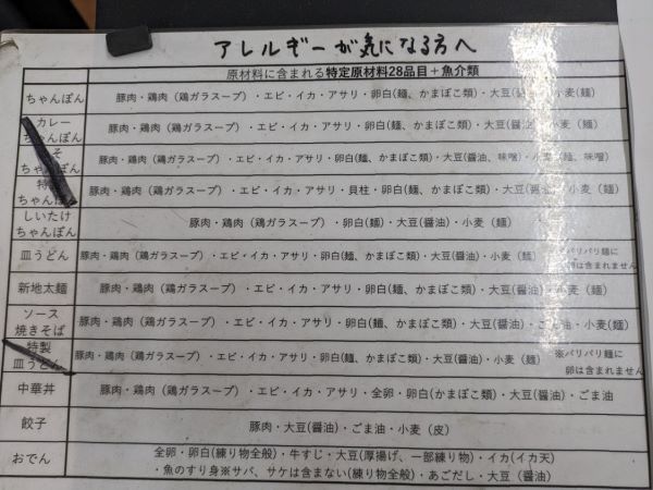 今回は「小ちゃんぽん」(850円)をいただいてみることにしました。ちなみに通常サイズ(950円)は麺が200gに対し、「小」は100g。器が小さめになるのでスープは少し減りますが、上の具材はほぼ同じ量とのこと!しっかり野菜やたんぱく質は摂りたいけれど、糖質は控えめにしたい私は大喜びしちゃいました。 因みにアレルギー表示も用意されていましたよ。