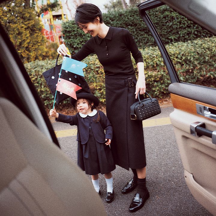 黒のラップスカートに ローファー×ソックスの足元で クラシカルな上品ママに